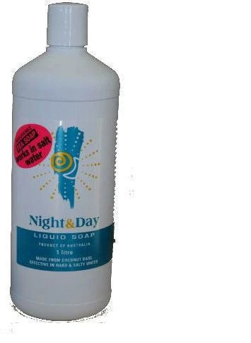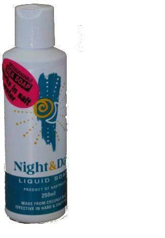 Night and Day Liquid Soap is mildly medicated with a balanced pH. It contains no animal fats and is derived from natural oils and skin softening agents. A soft cleansing lather is produced in fresh or hard salty water and is an excellent everyday shower soap or children’s bubble bath. It will not irritate the skin or sting the eyes. Its shampoo base produces soft manageable hair when used in fresh, hard or sea water.