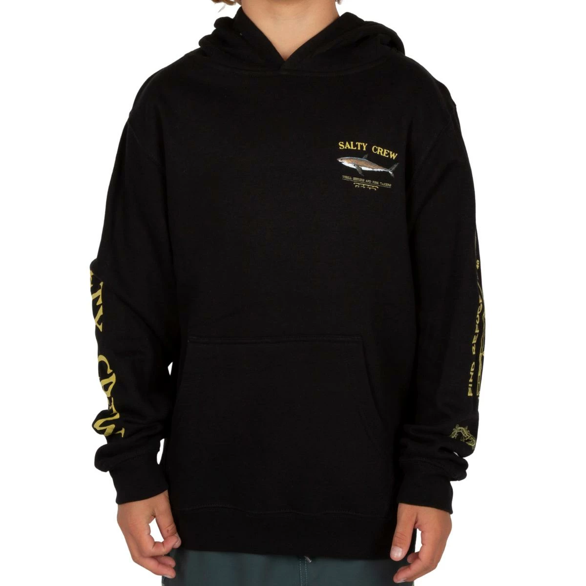 The Salty Crew Bruce Fleece Hoodie in black is a standard fit hooded fleece featuring screen-printed chest, back, and sleeves. Made from 80% cotton, 20% polyester. Available in sizes Small to 2XL.
