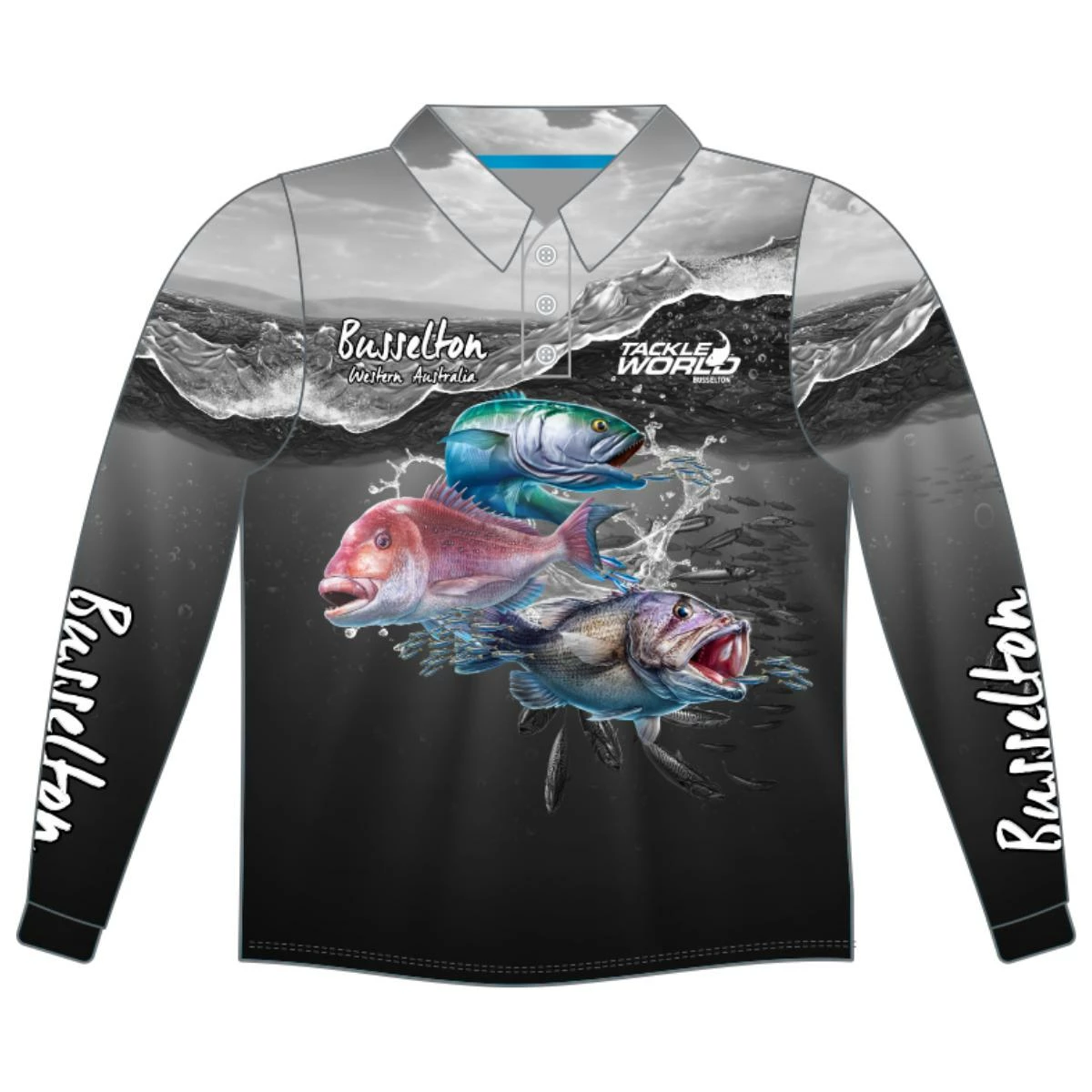 Our very own Tackle World Busselton Southern Species Shirt for kids in grey. Features a Tailor, Snapper and Dhufish printed on the front and back. Also has Busselton Western Australia printed on the front, back and arms along with Tackle World Busselton on front and back.